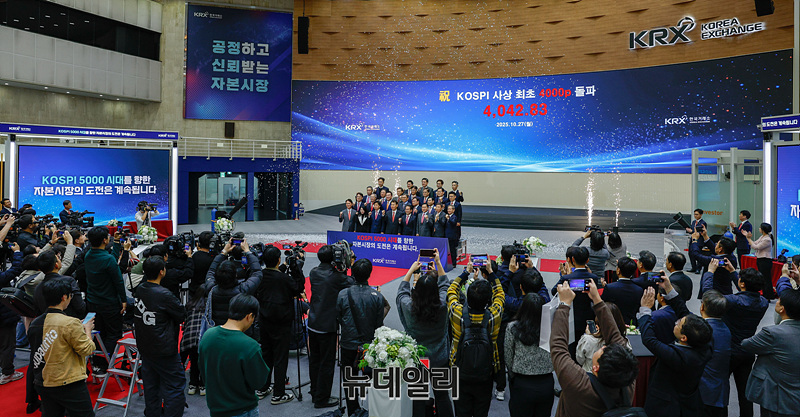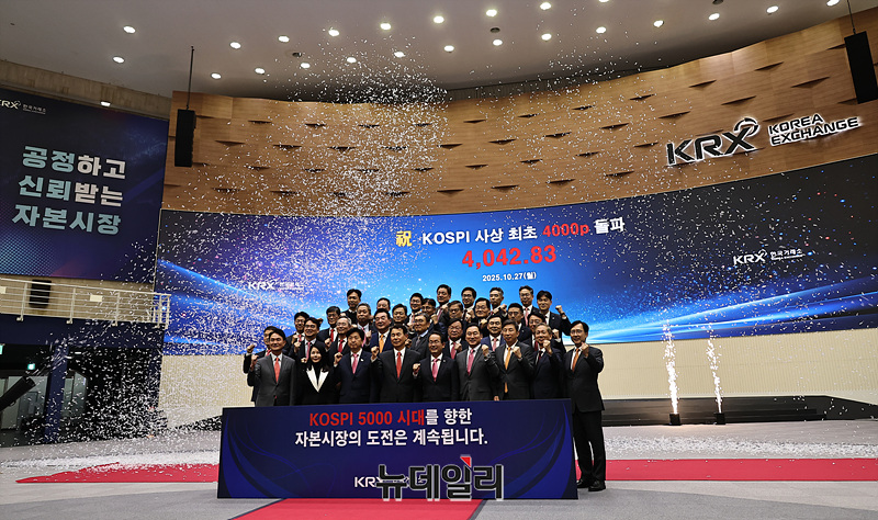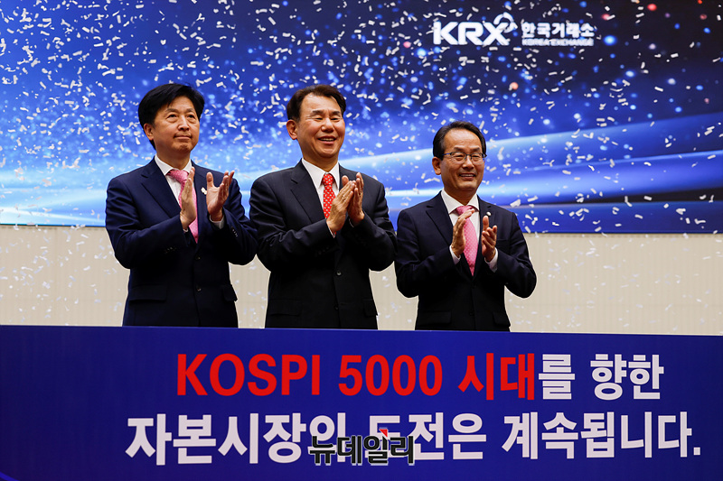 코스피 종가가 사상 처음으로 4000선을 넘은 27일 오후 서울 영등포구 한국거래소에서 오기형 더불어민주당 의원, 정은보 한국거래소 이사장, 강준현 더불어민주당 의원이 기념 촬영을 하고 있다.