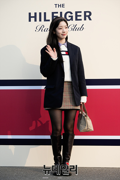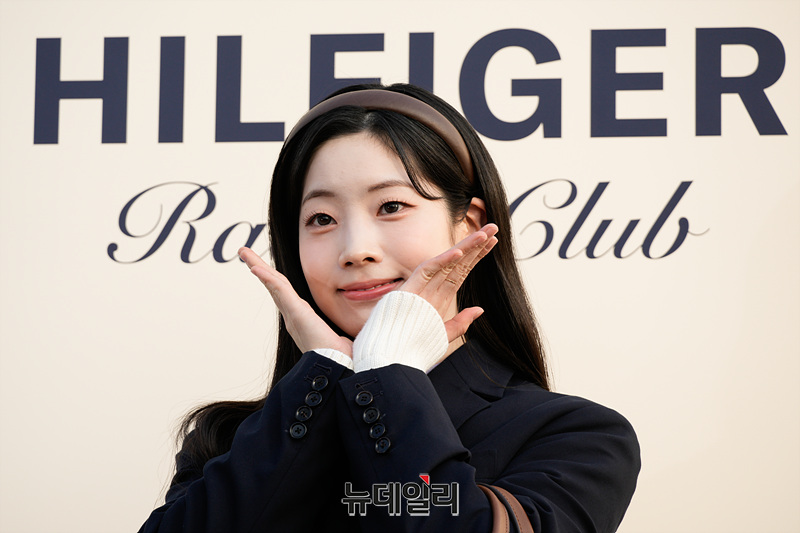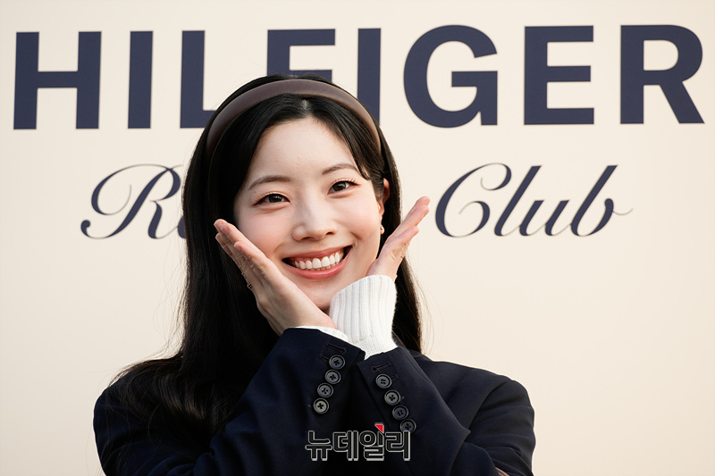트와이스 다현이 28일 오후 서울 강남구 코엑스 RF 주차장에서 열린 더 힐피거 레이싱 클럽 포토월에서 포즈를 취하고 있다.