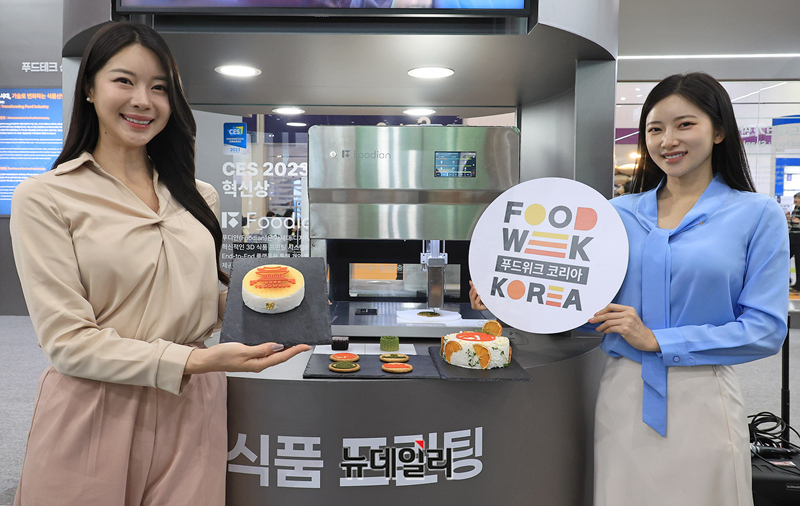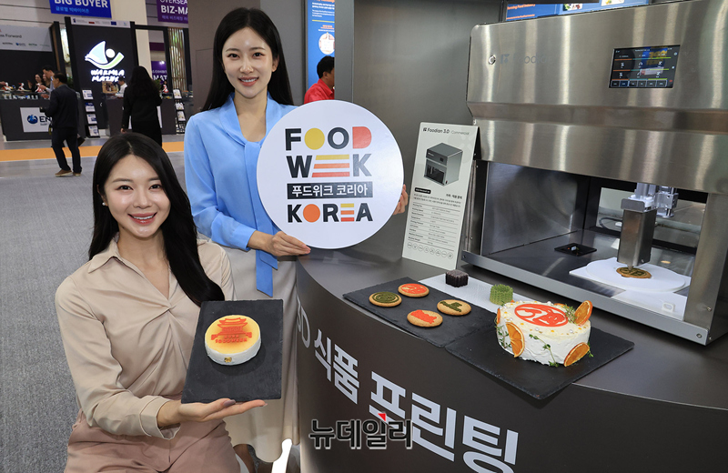 2025년 하반기 최대 식품 종합 전시회 '푸드위크 코리아(제20회 서울국제식품산업전)'가 29일 오전 서울 강남구 코엑스에서 개막한 가운데 모델들이 3D 식품 프린팅을 관람하고 있다.