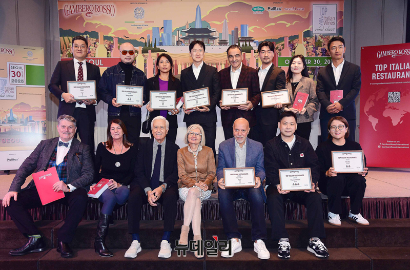 '감베로 로쏘 – 2025 TOP 이탈리안 와인 로드쇼'가 30일 서울 중구 앰배서더 서울 풀만 호텔에서 'TOP 이탈리안 레스토랑 2026' 발표 및 시상식을 개최한 가운데 피자 3개를 수상한 마리오네(Pizzeria Marione)가 기념촬영을 하고 있다. (왼쪽부터 에밀리아 가토 주한 이탈리아 대사, 김주영 마리오네 대표, 감베로 로쏘의 루이지 살레르노 CEO, 사진=와인21)