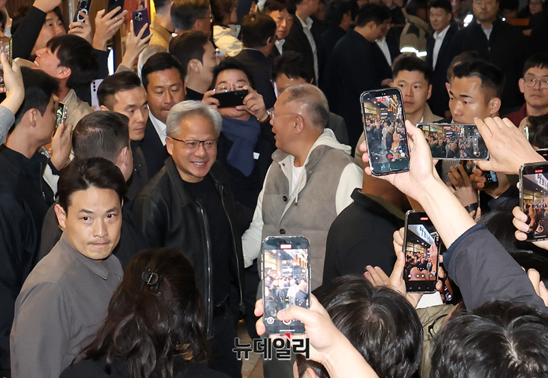 젠슨 황 엔비디아 CEO가 30일 서울 강남구 삼성동에서 이재용 삼성전자 회장, 정의선 현대차그룹 회장과 치킨회동에 입장하며 시민들에게 사인을 해주고 있다.