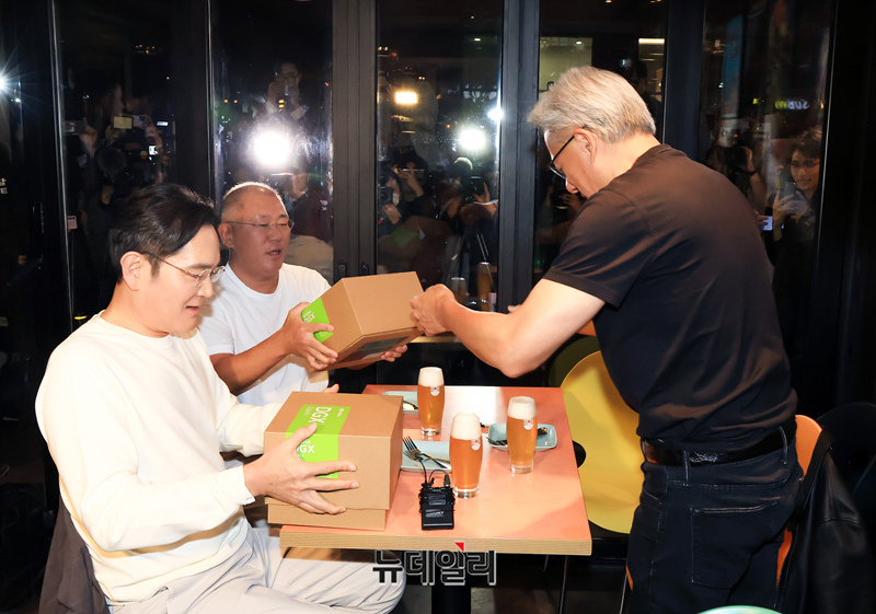 이재용 삼성전자 회장이 30일 오후 서울 강남구 삼성역 인근 깐부치킨 매장에서 정의선 현대차그룹 회장, 젠슨 황 엔비디아 최고경영자(CEO)과 치킨 회동 중 받은 선물을 공개하고 있다.