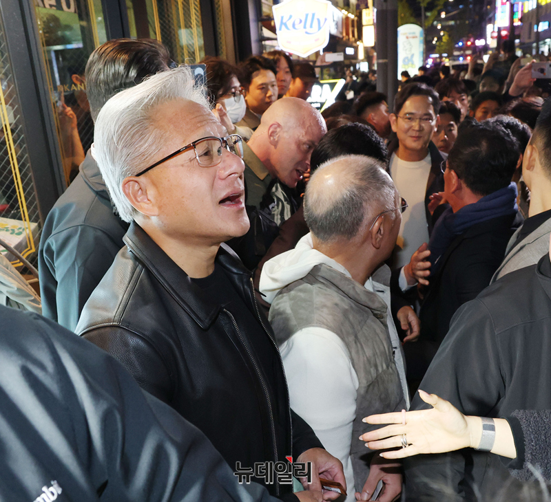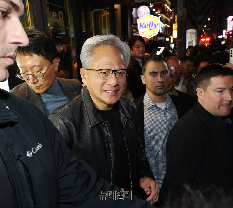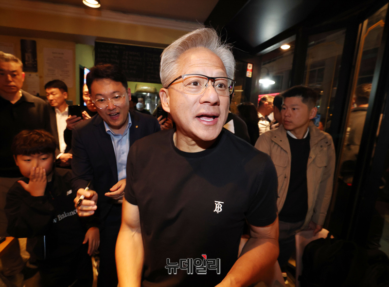 젠슨 황 엔비디아 최고경영자(CEO)가 30일 오후 서울 강남구 삼성역 인근 깐부치킨 매장에서 이재용 삼성그룹 회장, 정의선 현대차그룹 회장과 치킨 회동을 하기 위해 이동하고 있다.