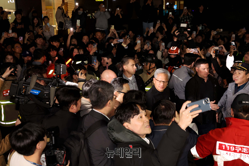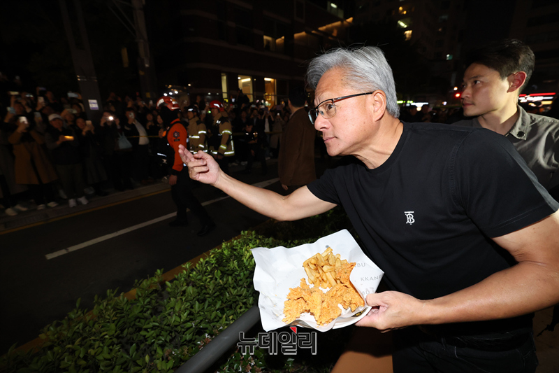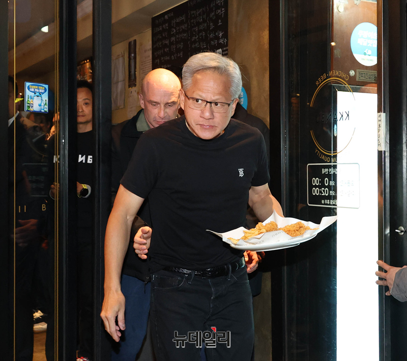 젠슨황 엔비디아 최고경영자가 30일 오후 이재용 삼성전자 회장, 정의선 현대자동차그룹 회장과 서울 강남구 깐부치킨 매장에서 치킨 회동 중 밖으로 나와 시민들에게 치킨 등을 나눠주고 있다.