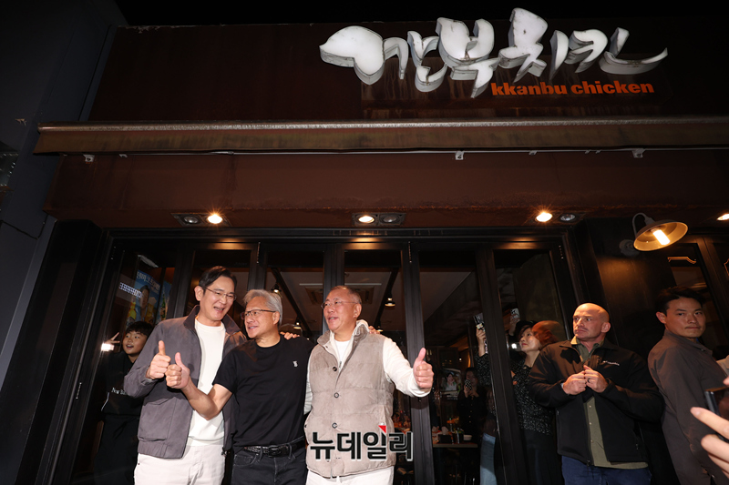 이재용 삼성전자 회장(왼쪽부터)과 젠슨 황 엔비디아 최고경영자(CEO), 정의선 현대차그룹 회장이 30일 저녁 서울 강남구 삼성동의 한 치킨집에서 치맥 회동을 마친 후 인사를 하고 있다.