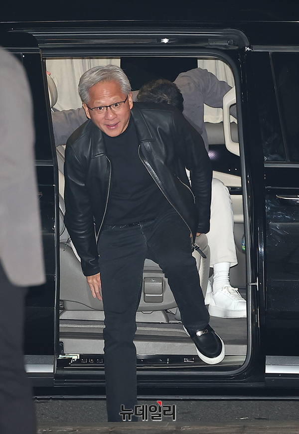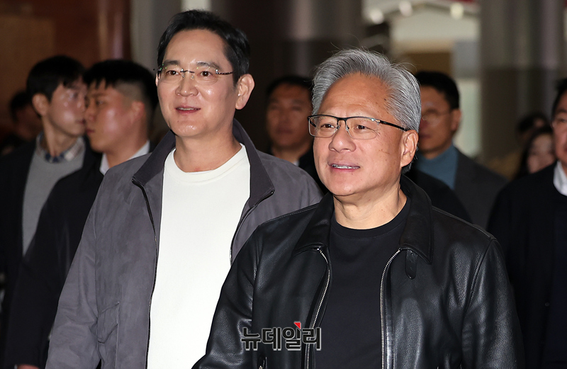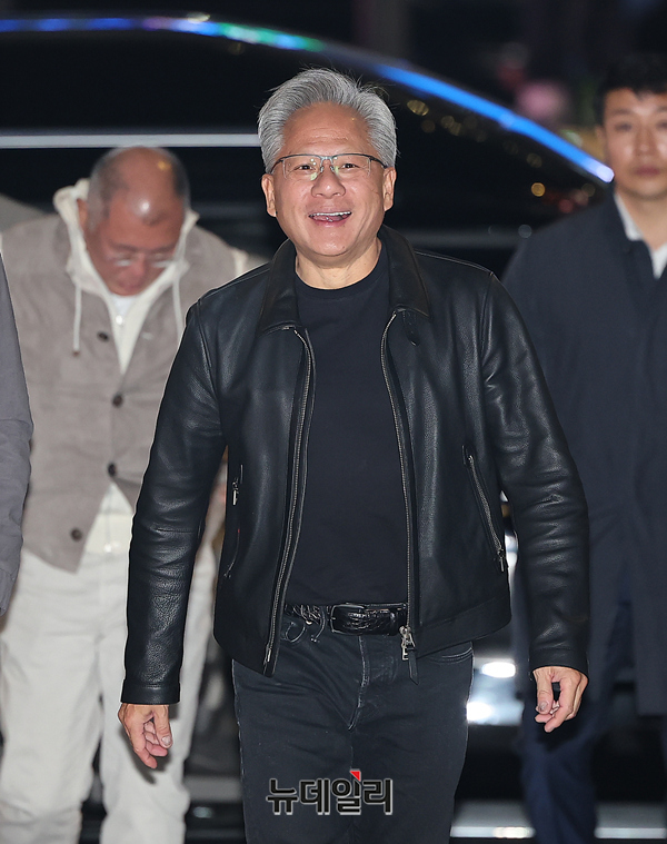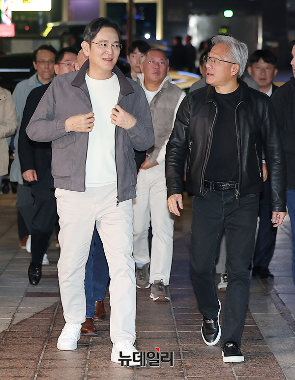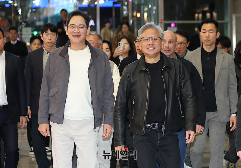 이재용 삼성전자 회장(왼쪽부터), 정의선 현대자동차그룹 회장, 젠슨 황 엔비디아 최고경영자(CEO)가 30일 오후 서울 강남구 코엑스에서 열리는 엔비디아 그래픽카드(GPU) '지포스'의 한국 출시 25주년 행사에 참석하기 위해 이동하고 있다.