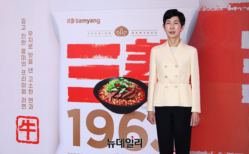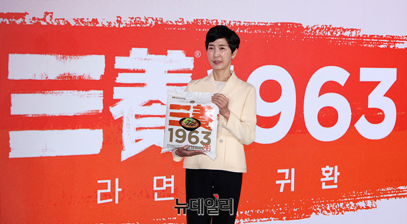 김정수 삼양식품 부회장이 3일 오전 서울 중구 보코서울명동 호텔에서 열린 신제품 공개 행사에서 신제품 '삼양1963'을 선보이고 있다.