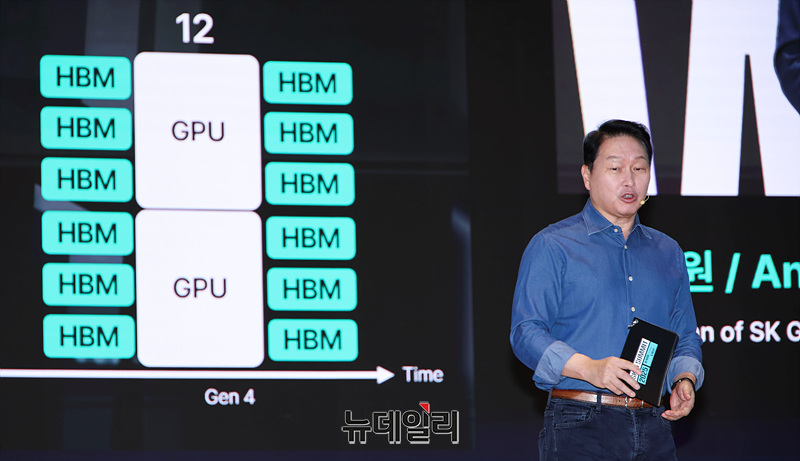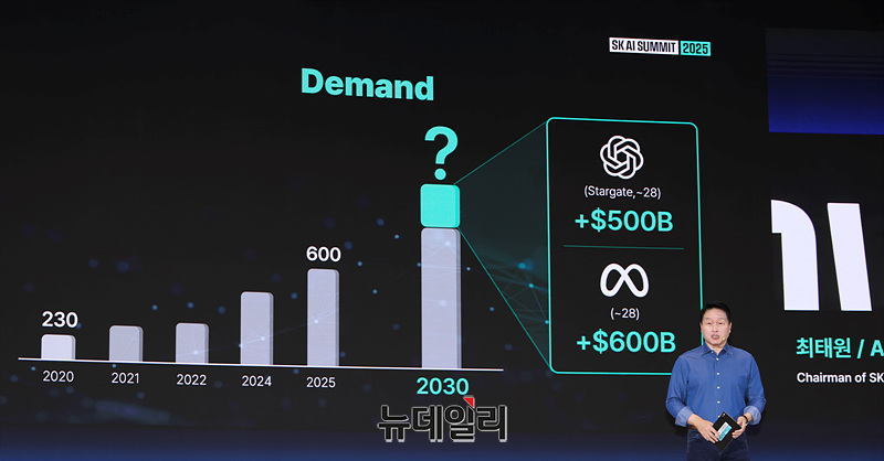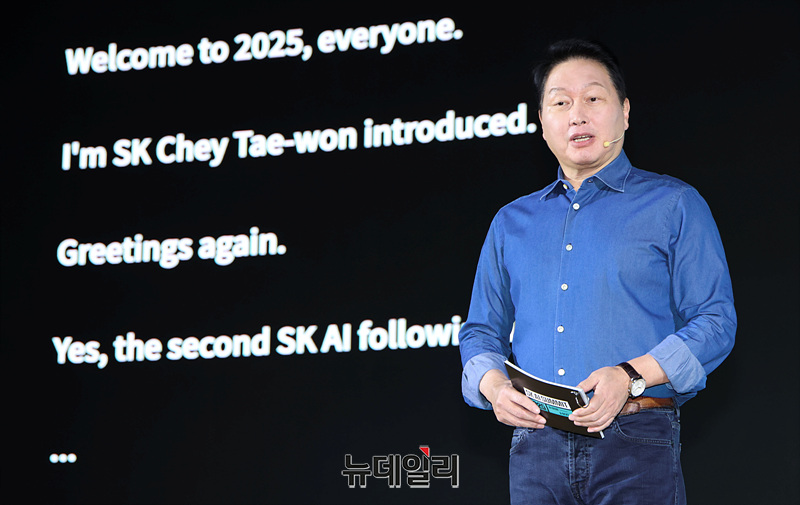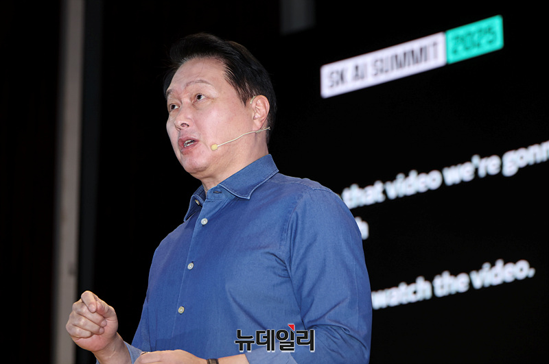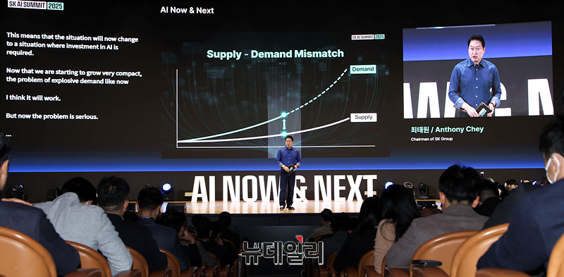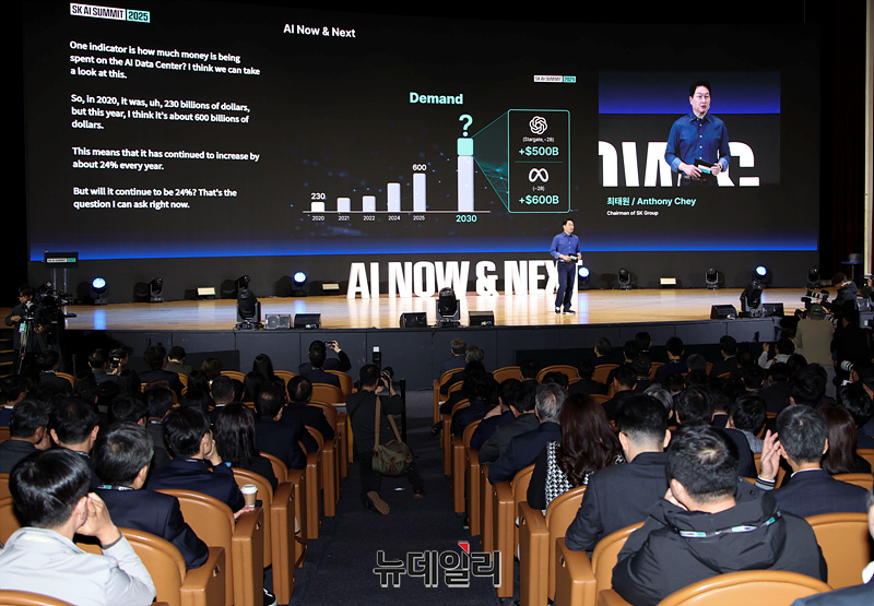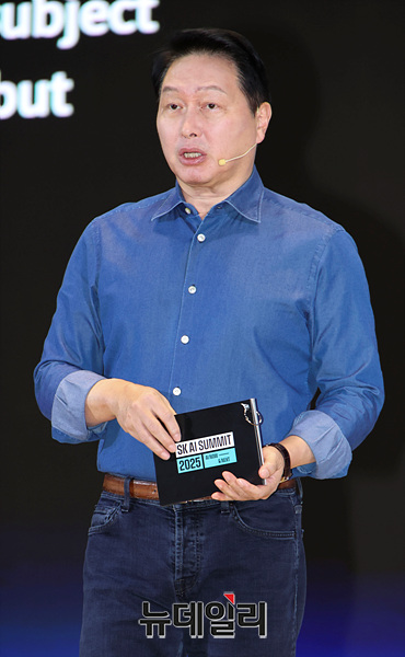 최태원 SK그룹 회장이 3일 오전 서울 강남구 코엑스에서 열린 'SK AI 서밋 2025'에서 'AI NOW & NEXT'를 주제로 기조연설을 하고 있다.