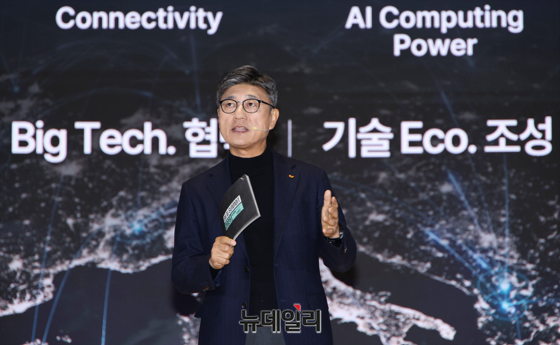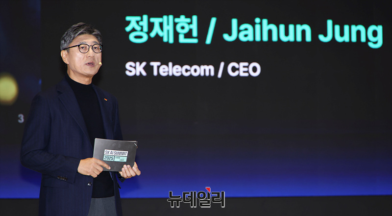 정재헌 SK텔레콤 대표이사 사장이 3일 오전 서울 강남구 코엑스에서 열린 'SK AI 서밋 2025'에서 'AI 혁신의 중심, SKT AI Infra의 Now & Next'를 주제로 발표하고 있다.