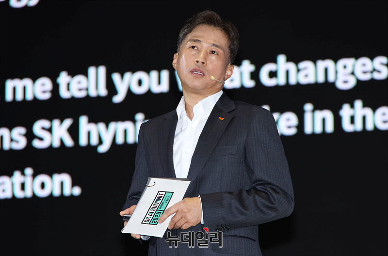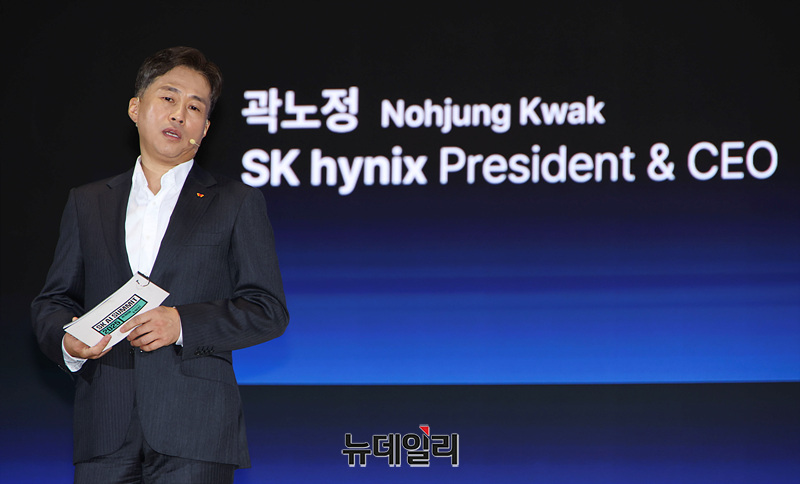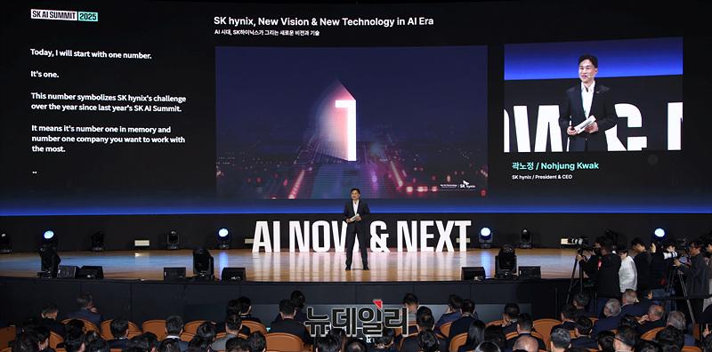 곽노정 SK 하이닉스 CEO가 3일 오전 서울 강남구 코엑스에서 열린 'SK AI 서밋 2025'에서 'AI 시대, SK하이닉스가 그리는 새로운 비전과 기술'을 주제로 발표하고 있다.