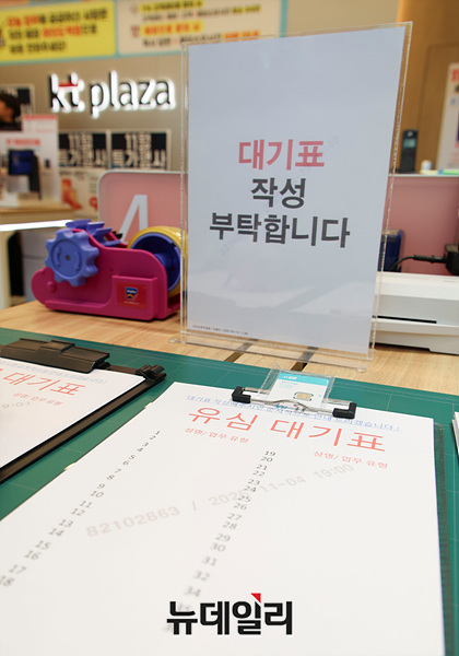 KT가 해킹 피해 후속 대책으로 전 가입자를 대상으로 무상 유심 교체를 시작한 5일 오전 서울 시내 한 KT 대리점을 찾은 고객이 상담을 받고 있다.