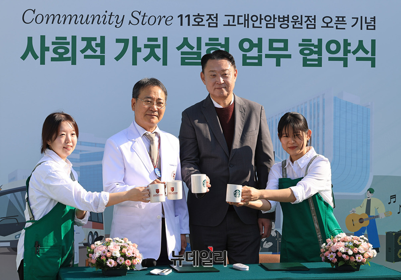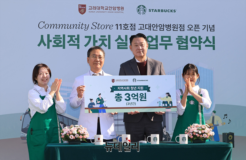 손정현 스타벅스 코리아 대표이사와 이성우 고대안암병원 진료부원장이 5일 오전 서울 성북구 스타벅스 고대안암병원점에서 지역사회 청년 건강 및 자립을 위한 커뮤니티 스토어 11호점을 오픈하며 업무협약식을 갖고 있다.