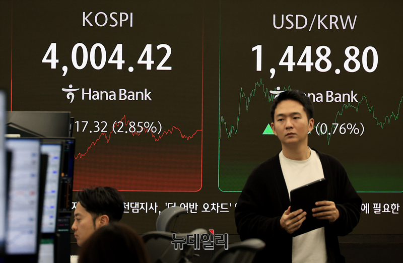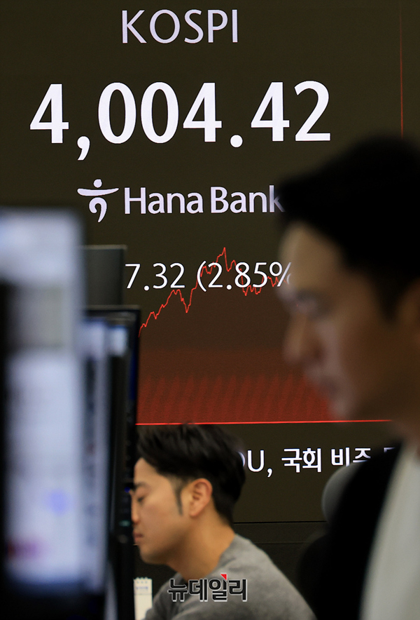 코스피가 이틀 연속 하락세를 이어가고 있는 5일 서울 중구하나은행 딜링룸 현황판에 전 거래일 대비 117.32포인트(2.85%) 내린 4004.42에 마감한 지수가 표시되고 있다.