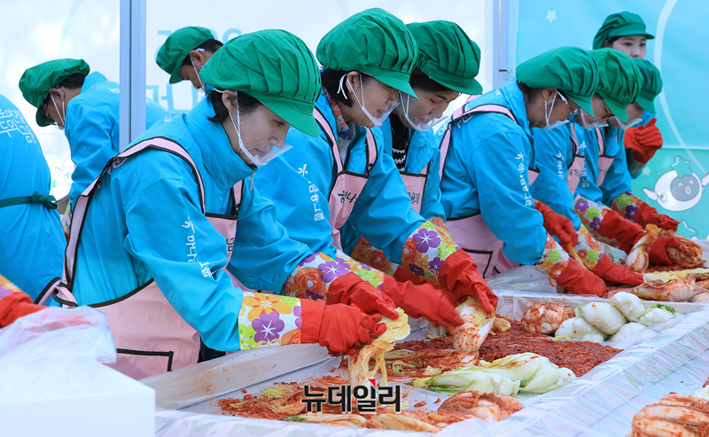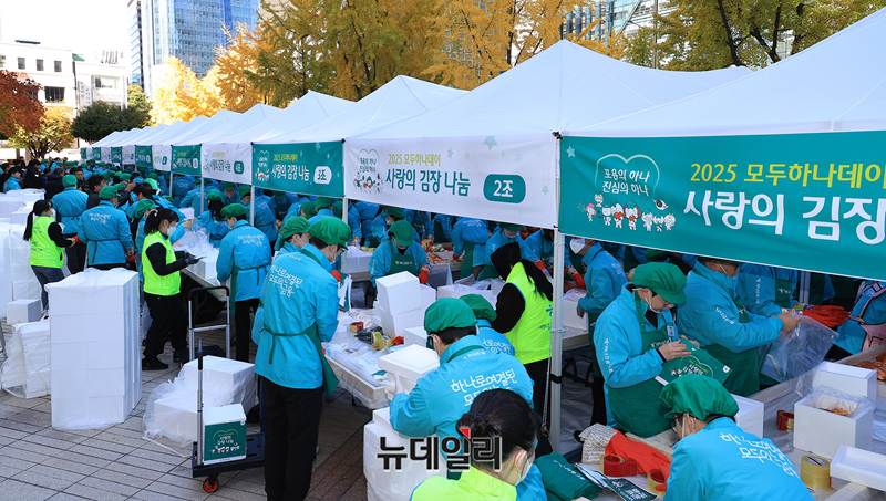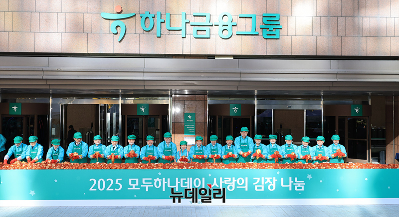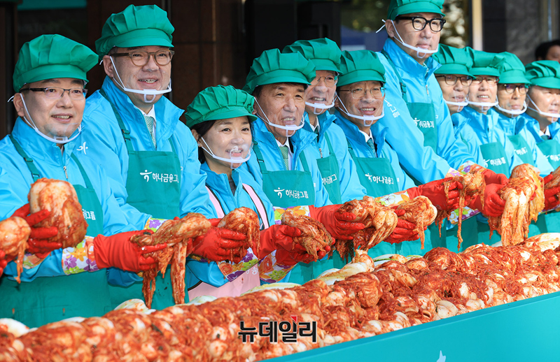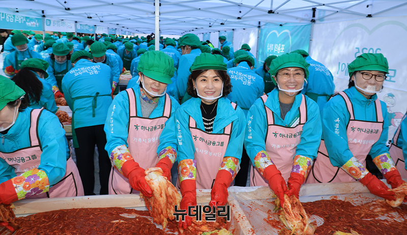 함영주 하나금융그룹 회장을 비롯한 하나금융그룹 임직원 등 가족사랑봉사단이 10일 오전 서울 중구 명동사옥 앞에서 열린 '2025 모두하나데이' 사랑의 김장나눔 행사에서 김장 봉사활동을 하고 있다.