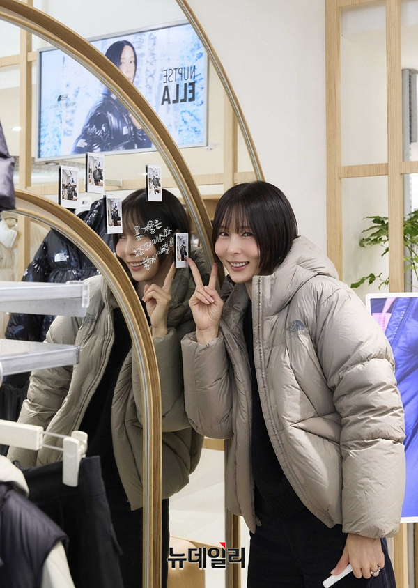 영원아웃도어(대표 성기학)의 글로벌 아웃도어 브랜드 노스페이스가 새롭게 발탁한 홍보대사 김나영이 12일 ‘노스페이스 한남점 우먼즈’에서 보온성과 경량성이 뛰어난 ‘스카이 다운 재킷’을 입고 포즈를 취하고 있다. (사진=노스페이스)