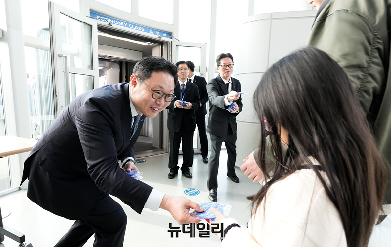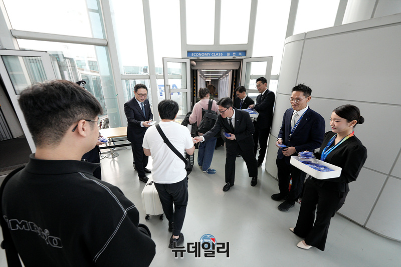 윤철민 파라타항공 대표와 임직원들이 17일 오전 인천국제공항 제1여객터미널에서 탑승객들에게 기념품을 전달하고 있다.