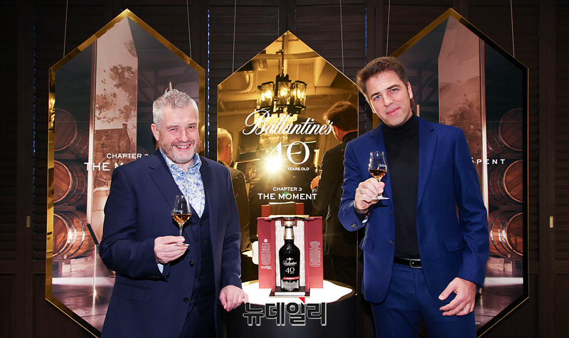 샌디 히슬롭 발렌타인 마스터 블랜더와 미겔 파스칼 페르노리카 코리아 마케팅 총괄 전무가 19일 오전 서울 강남구 까사알렉시스 도산점에서 '발렌타인 40년 마스터클래스 컬렉션 더 모먼트'를 선보이고 있다.
