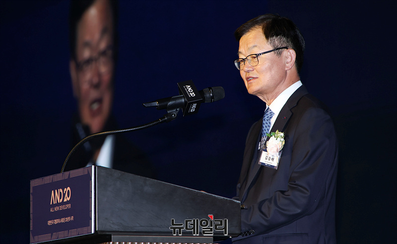 김승배 한국부동산개발협회 협회장이 20일 오전 서울 강남구 그랜드 인터컨티넨탈 서울 파르나스 그랜드볼룸에서 열린 글로벌 디벨로퍼 컨퍼런스에서 개회사를 하고 있다.