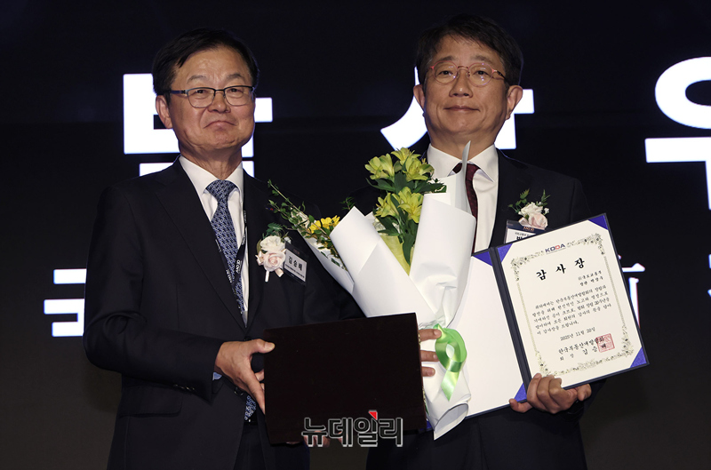 박상우 전 국토교통부 장관이 20일 오후 서울 강남구 그랜드 인터컨티넨탈 서울 파르나스에서 열린 한국부동산개발협회(KODA, Korea Developer Association) 창립 20주년 기념행사에서 특별공로상을 수상하고 김승배 협회장과 기념촬영을 하고 있다.이날 기념행사에는 비전 선포식을 통해 향후 20년간 KODA가 지향할 △공공성과 투명성 강화 △데이터 기반 산업 혁신 △금융 안정성 및 리스크 관리체계 확립 △ESG 기반 도시개발 △글로벌 네트워크 확장 등을 중심으로 한 비전을 발표했다. 또 한국디벨로퍼협회로 협회명을 바꾸고, 새 CI를 공개했다.