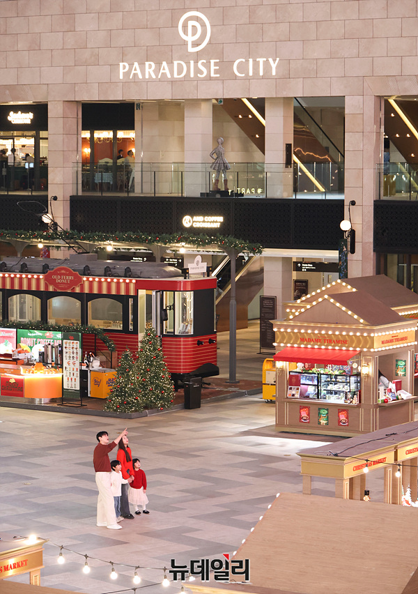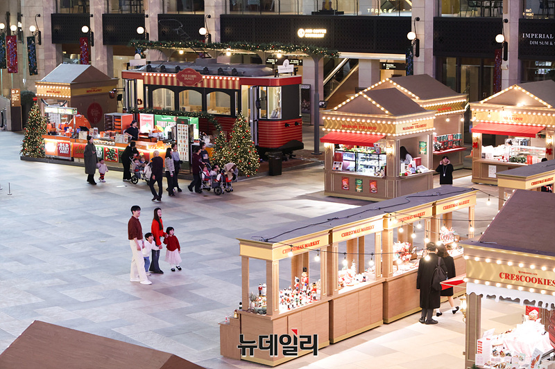 파라다이스시티가 연말을 맞아 25일 오전 인천 중구 파라다이스 플라자에서 '홀리데이 익스프레스' 콘셉트의 크리스마스마켓을 선보이고 있다.크리스마스마켓은 파라다이스시티가 매년 11월 하순부터 1월1일까지 운영하는 팝업 행사다.'플라자'의 실내 대형광장 2천700평 규모의 공간에는 서울 3대 도넛 '올드패리도넛', 프리미엄 수플레 치즈케이크 '치플레', 미국식 수제 쿠키 '크리에잇쿠키' 등 2030세대 사이에서 인기인 F&B 브랜드와 '피치스트로베리' '우더풀라이프' '제이닷트리' 등 크리스마스 소품 브랜드 총 17곳을 한자리에 모았다.