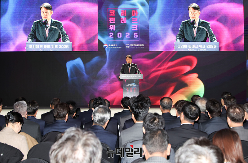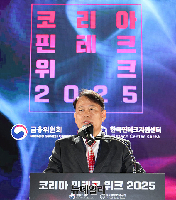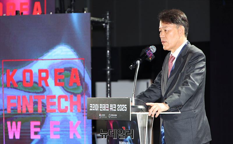 윤한홍 국회 정무위원회 위원장이 26일 오전 서울 서초구 aT센터에서 열린 코리아 핀테크 위크 2025 개막식에서 축사를 하고 있다.