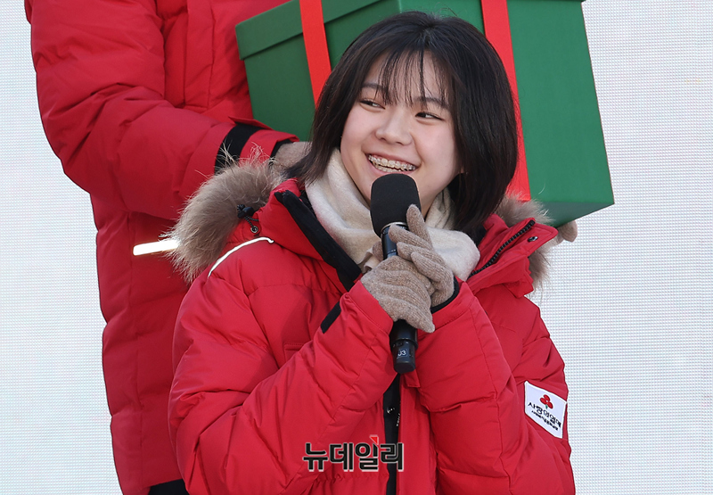 • 백은별 서울 사랑의열매 최연소 아너소사이어티 회원이 1일 오후 서울 광화문광장에서 열린 ‘희망2026나눔캠페인’ 사랑의 열매 출범식에서 인사말을 하고 있다.