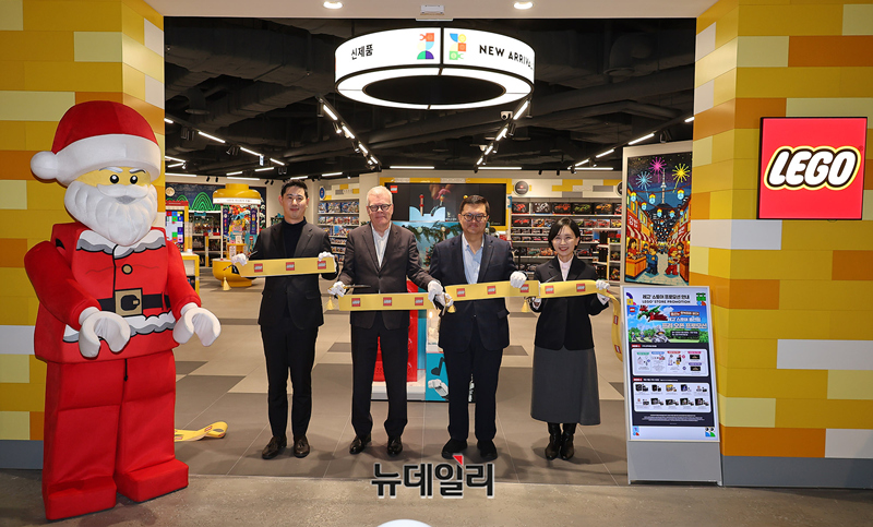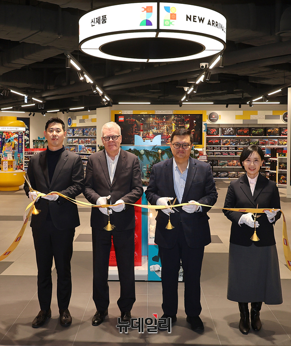 이선한 HDC아이파크몰 팀장(왼쪽부터), 미카엘 헴니티 빈터 주한 덴마크 대사, 김대수 HDC아이파크몰 대표이사, 정희영 레고코리아 대표가 4일 오전 서울 용산구 아이파크몰 레고스토어 용산점에서 열린 프리오픈 행사에서 테이프 커팅을 하고 있다.레고코리아는 국내 최대 규모 '공식 레고스토어 용산점'을 12월 5일 정식 오픈한다.'K-컬처'를 테마로 한 ‘일월오봉도’ 및 ‘광장시장’ 레고 모자이크와 ‘광화문·근정전’ 디오라마 등 다채로운 레고 작품을 선보인다.