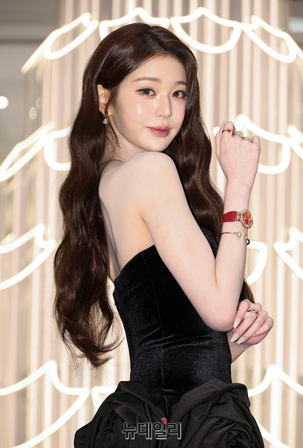 아이브 장원영이 4일 오전 서울 강남구 신세계백화점에서 열린 럭셔리 주얼리 브랜드 불가리의 '홀리데이 디바스 드림' 팝업스토어 오픈 기념 포토월에서 포즈를 취하고 있다.