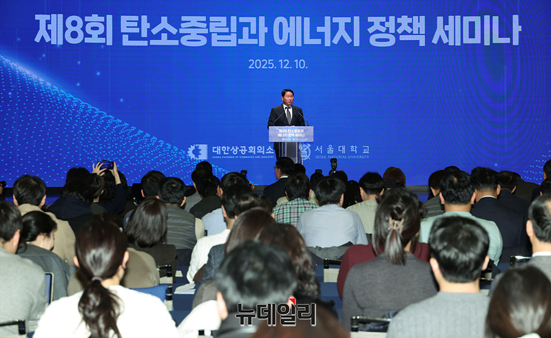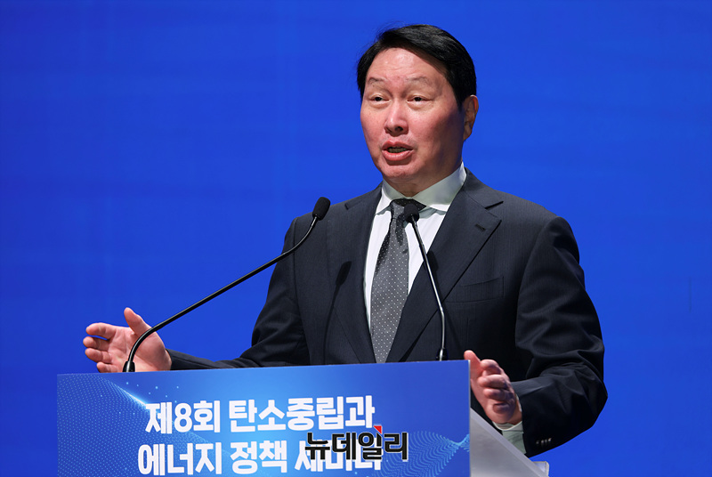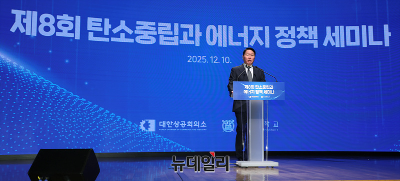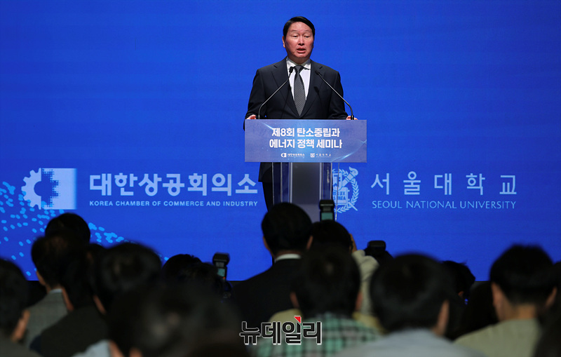 최태원 대한상공회의소 회장이 10일 오후 서울 중구 대한상공회의소에서 열린 제8회 탄소중립과 에너지 정책 세미나에서 환영사를 하고 있다.