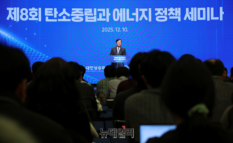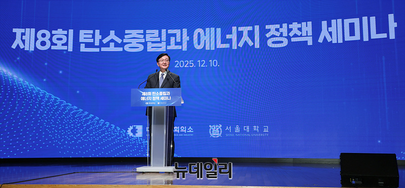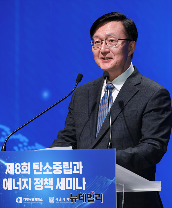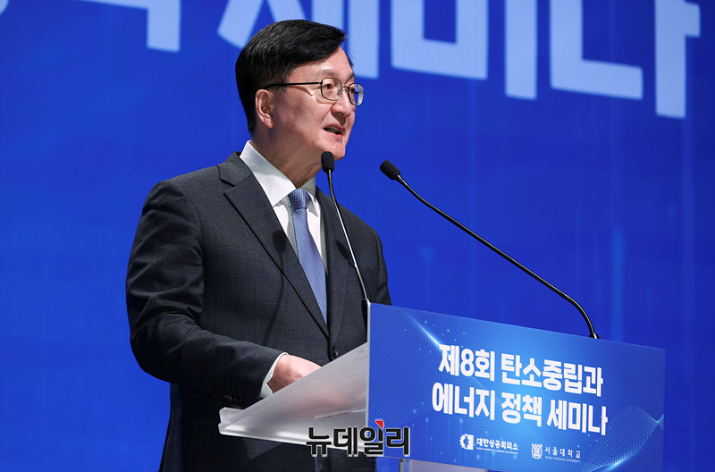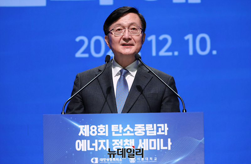 유홍림 서울대학교 총장이 10일 오후 서울 중구 대한상공회의소에서 열린 제8회 탄소중립과 에너지 정책 세미나에서 환영사를 하고 있다.