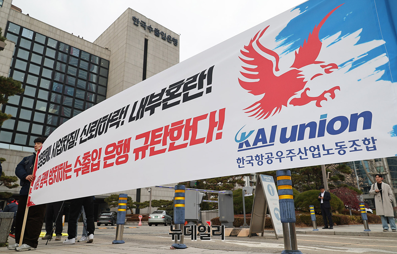 한국항공우주산업(KAI) 노동조합이 10일 오후 서울 여의도 한국수출입은행 앞에서 사장 공백을 방치하는 수출입은행을 규탄하는 상경집회를 갖고 있다.
