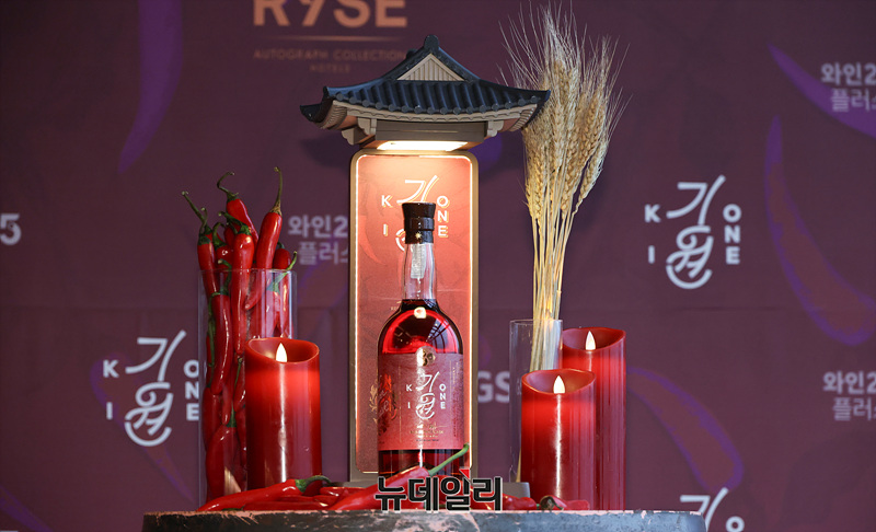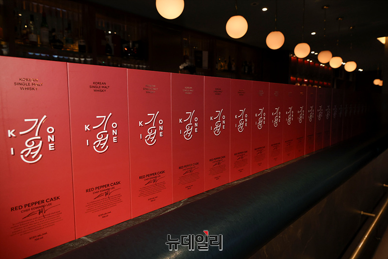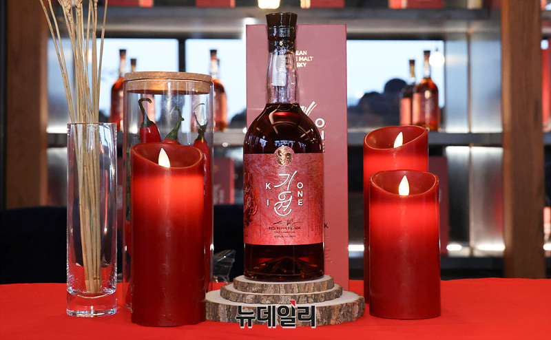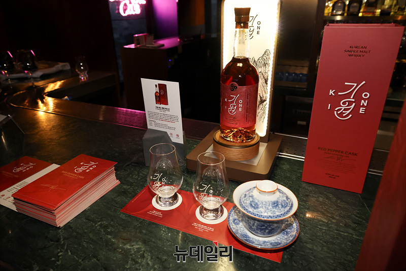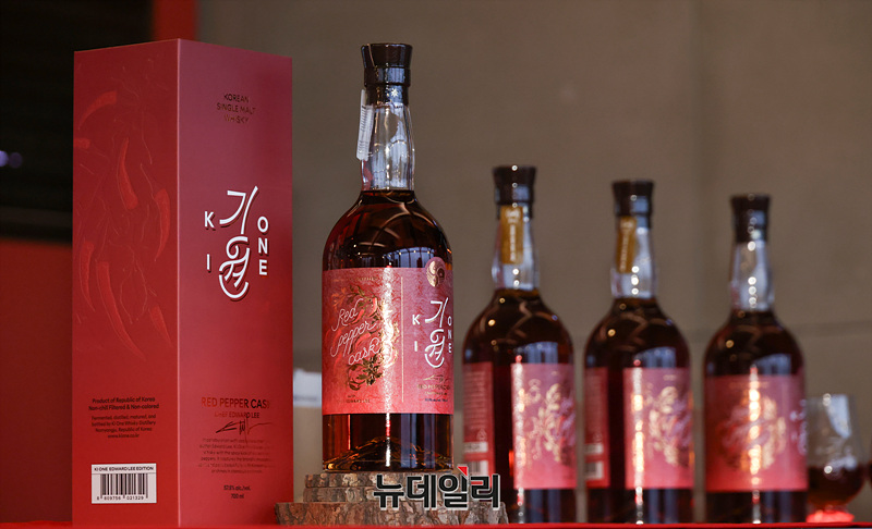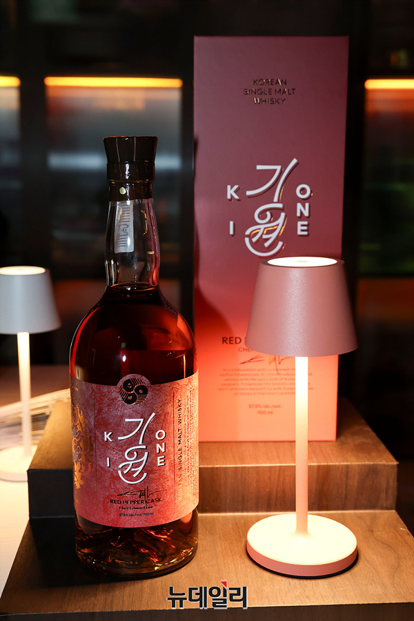 대한민국 최초 싱글몰트 위스키 기원(Ki One)이 16일 오전 서울 마포구 라이즈 호텔에서 한정판 '기원 레드 페퍼 캐스크'를 선보이고 있다.