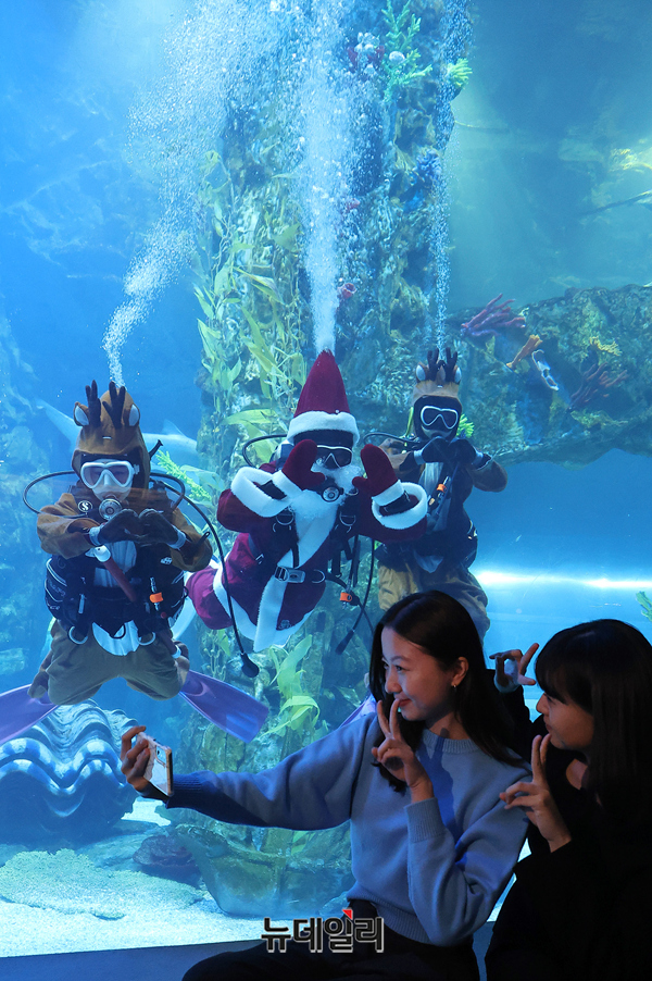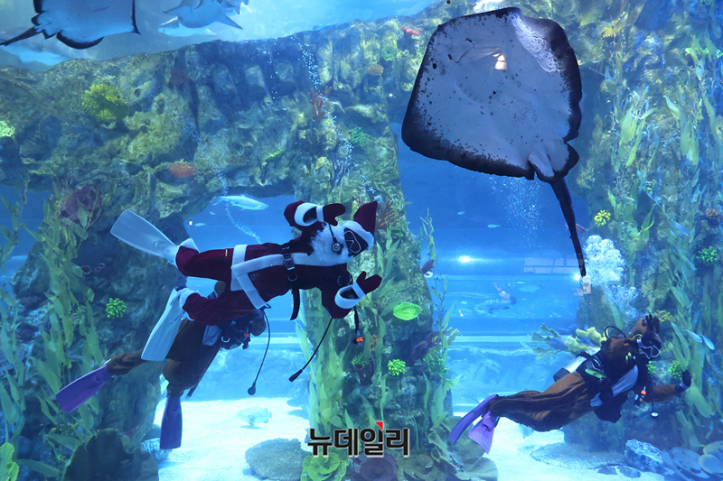 산타와 루돌프로 변신한 아쿠아리스트가 16일 오전 서울 송파구 롯데월드 아쿠아리움 메인수조에서 크리스마스 특별 이벤트로 진행되는 수중 퍼포먼스를 소개하고 있다.롯데월드 아쿠아리움은 크리스마스 특별 이벤트로 19일부터 28일까지 10일동안 하루 2회(14시, 16시30분) 산타와 루돌프로 변신한 아쿠아리스트가 선보이는 수중 퍼포먼스를 선보인다.또 바다사자존에는 산타로 변신한 아쿠아리스트가 바다사자와 함께 행동풍부화를 매일 1회(15시) 진행한다. 매주 금, 토, 일 2회(12시, 16시) '산타가 들려주는 펭귄이야기'도 준비해 손님을 맞이한다.