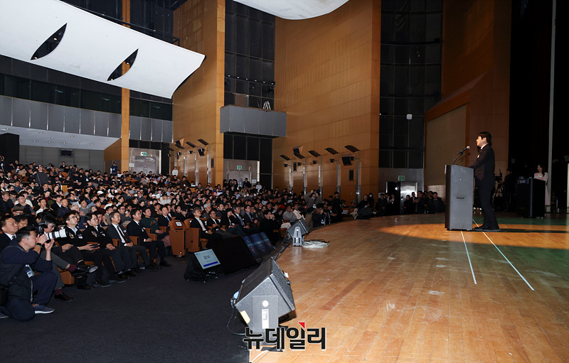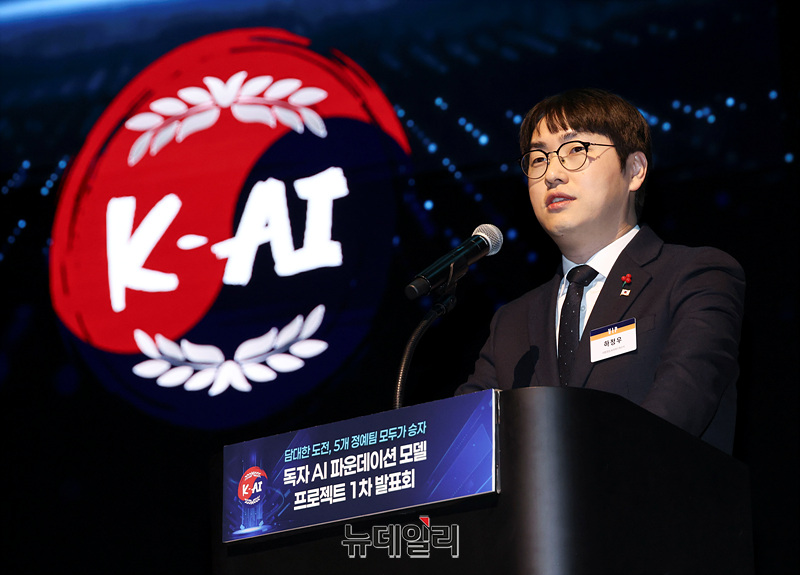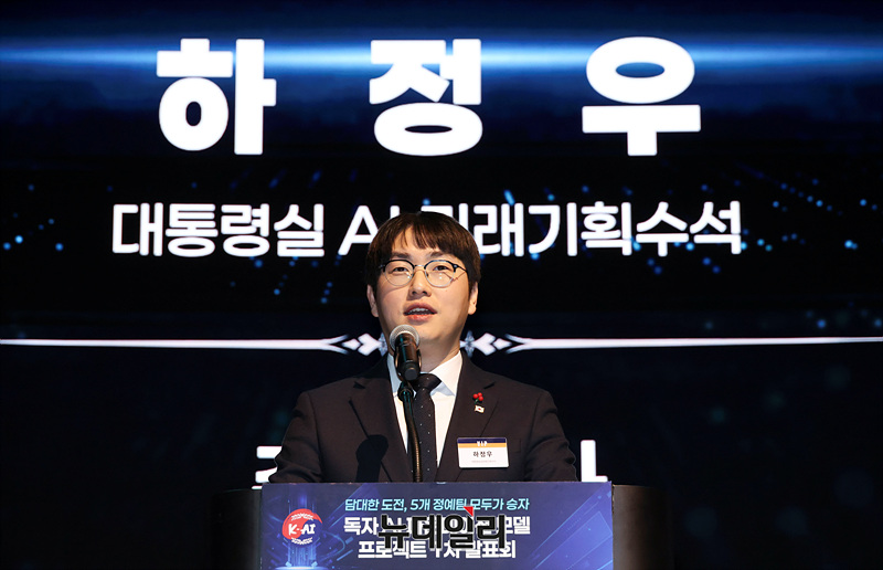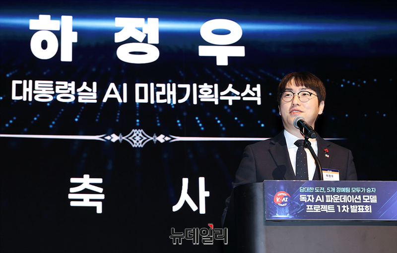 하정우 대통령실 AI미래기획수석이 30일 오후 서울 강남구 코엑스에서 열린 '독자 AI 파운데이션 모델' 프로젝트 1차 발표회에서 축사를 하고 있다.