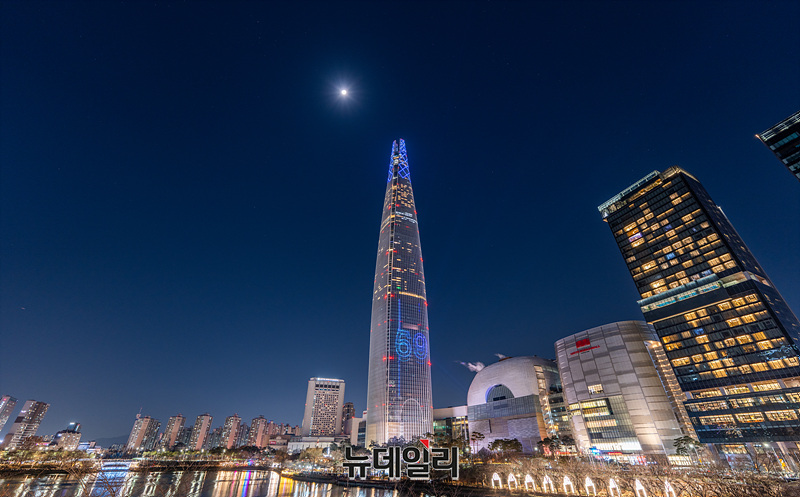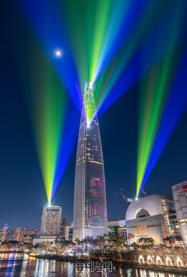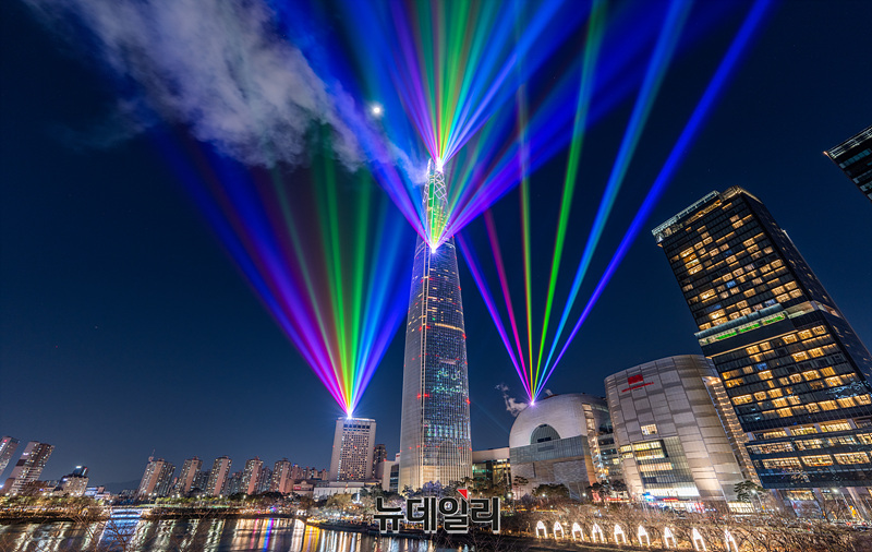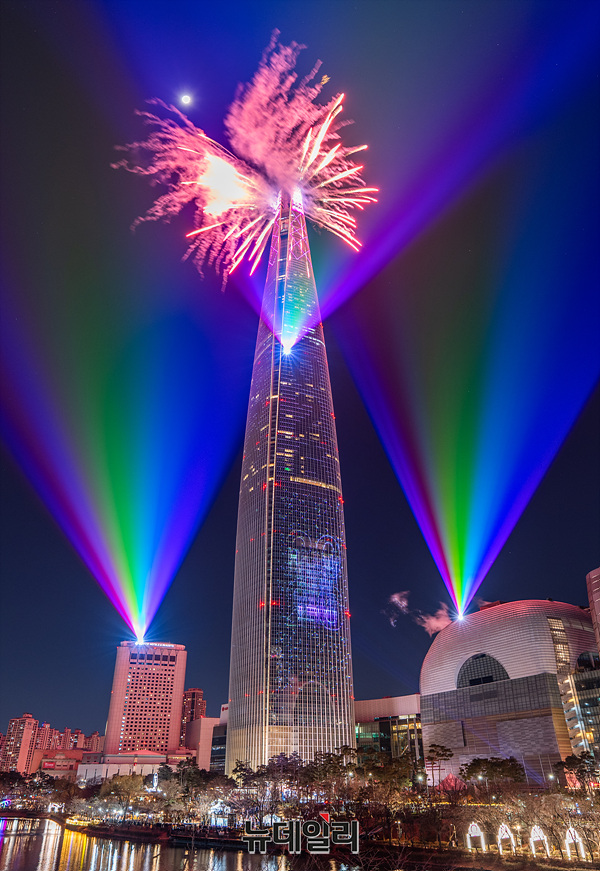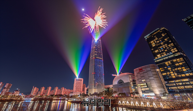 2026년 병오년 새해를 맞은 1일 오전 서울 송파구 롯데월드타워에서 열린 '2026 롯데월드 카운트다운 행사'에서 새해를 축하하는 메시지와 함께 레인보우 레이저 라이팅 쇼와 뷸꽃쇼가 펼쳐지고 있다.