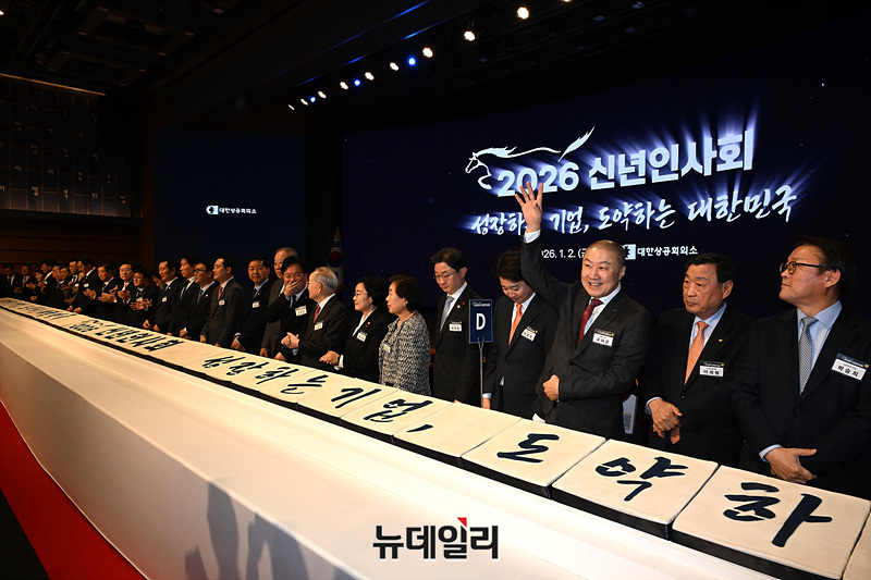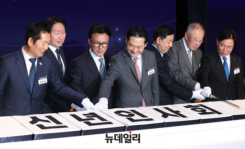 김민석(오른쪽 세 번째) 국무총리와 최태원(왼쪽 두 번째) 대한상공회의소 회장, 정청래(왼쪽) 더불어민주당 대표, 장동혁 국민의힘 대표가 2일 오후 서울 중구 대한상공회의소에서 열린 2026 경제계 신년인사회에서 떡케이크를 자르고 있다. (사진=공동취재단)