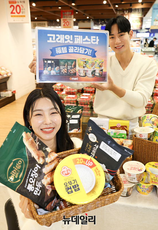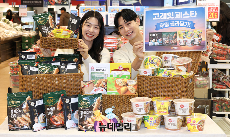 이마트가 5일 오전 서울 용산점에서 2026년 새해 첫 세일 '고래잇 페스타'를 알리고 있다.이번 행사에는 고객들이 선호하는 간편식과 즉석식품을 중심으로 '골라담기' 혜택을 강화했다.CJ 고메 만두 2종(샤오롱바오 141g, 새우하가우 135g), 비비고 통새우만두, 통오징어 만두(200g, 각)를 대상으로 '만두 골라담기' 행사를 진행해 5개 구매 시 19,900원에 판매한다.간편 한 끼 수요를 반영한 '컵밥 골라담기 행사도 진행한다. 오뚜기, CJ 브랜드의 컵밥을 4개 구매 시 9,980원에 선보인다. 두부, 참기름, 콜라/사이다, 상온면 등 다양한 먹거리를 최대 50% 할인한다.