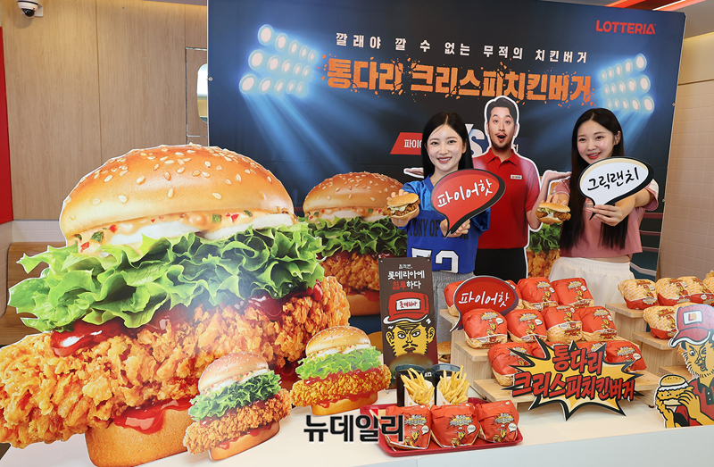 롯데GRS(대표이사 이원택)가 운영하는 버거 프랜차이즈 브랜드 롯데리아가 6일 오전 서울 용산구 숙대입구역점에서 통다리살 패티로 맛을 낸 '통다리 크리스피치킨버거' 2종을 소개하고 있다.