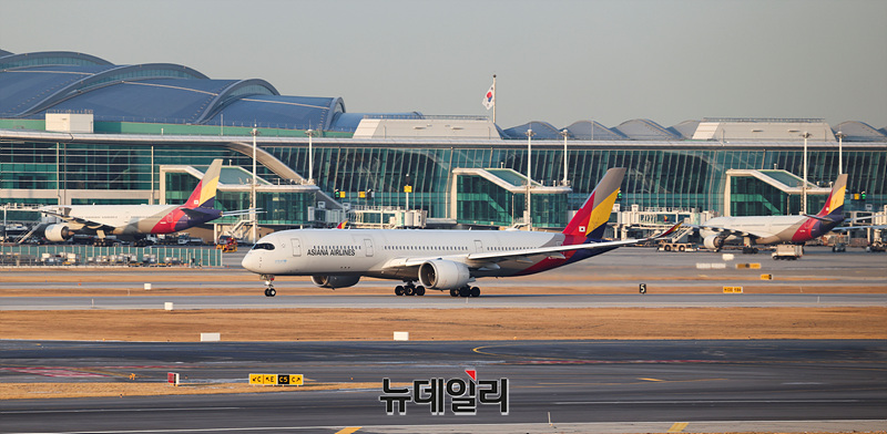 아시아나항공이 인천국제공항 제2여객터미널 운항을 개시한 14일 오전 대한항공 여객기와 아시아나항공 여객기가 출발 준비를 하고 있다. (인천=서성진 기자)