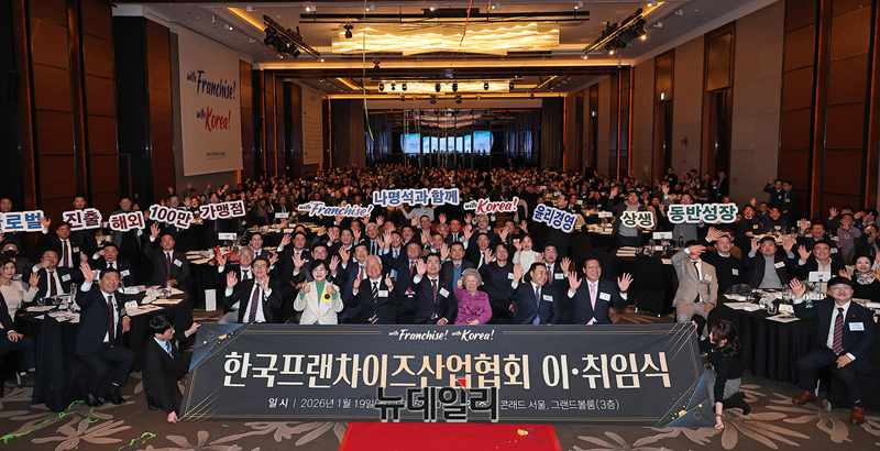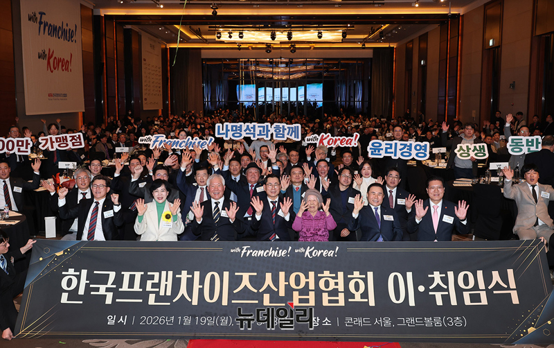 나명석 신임 한국프랜차이즈산업협회장을 비롯한 내빈들이 19일 오후 서울 여의도 콘래드 서울에서 열린 협회장 이취임식에서 기념촬영을 하고 있다.