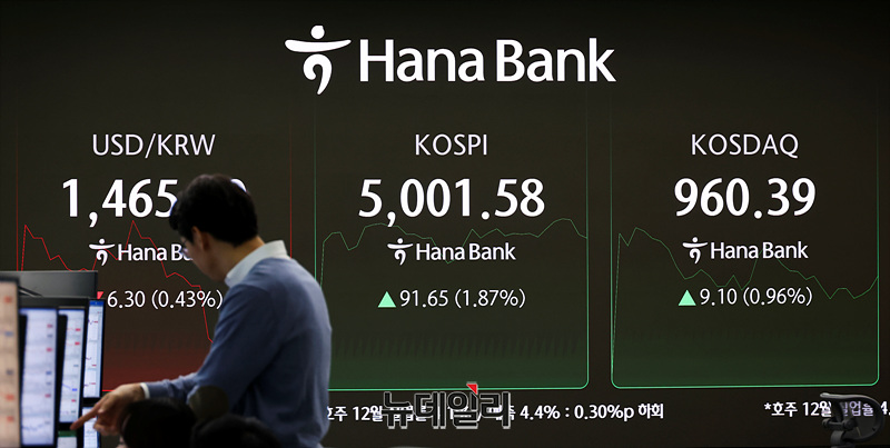 사상 첫 코스피 5,000을 돌파한 22일 오전 서울 중구 하나은행 본점 딜링룸 현황판에 코스피와 원 달러 환율이 표시되고 있다.