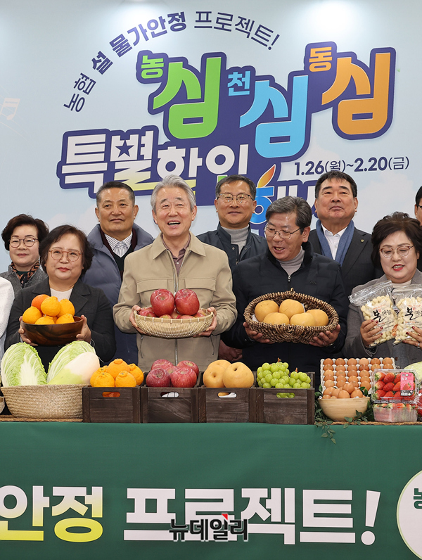 강호동 농협중앙회장 등 주요 참석자들이 26일 오전 서울 서초구 농협하나로마트 양재점에서 설 물가안정 프로젝트 '농심! 천심! 동심! 특별할인행사'를 알리며 기념촬영을 하고 있다.이날 행사에는 농협중앙회장, 농축협 조합장, 한국소비자연맹회장 등이 참석했다.