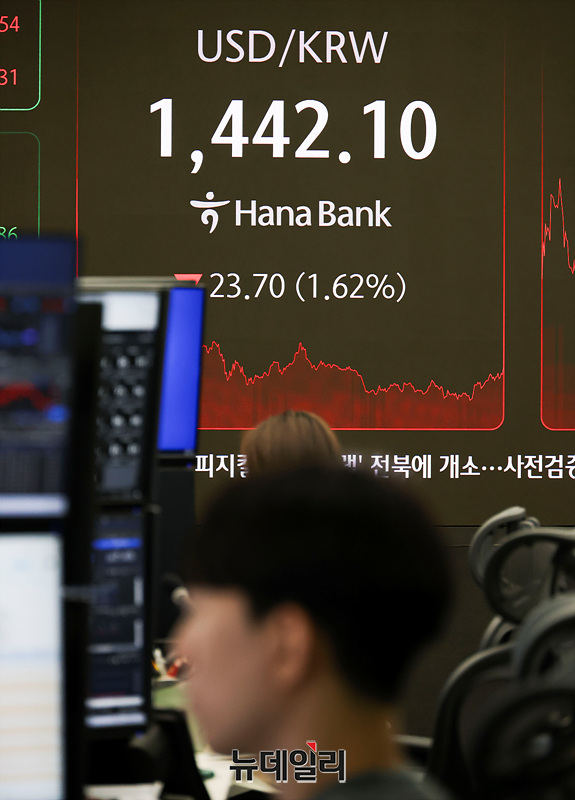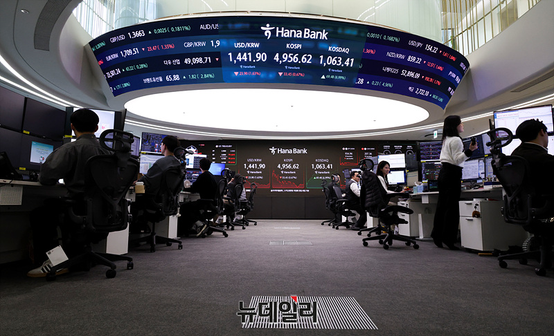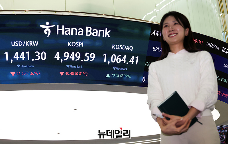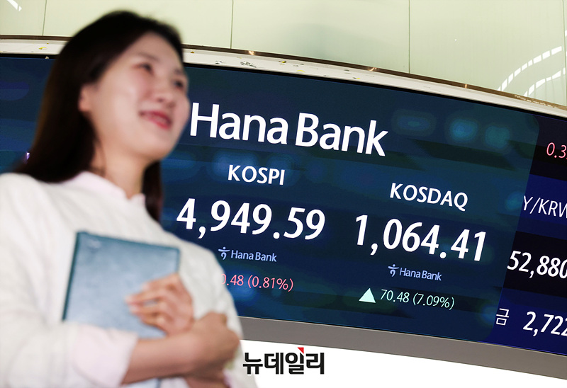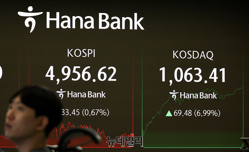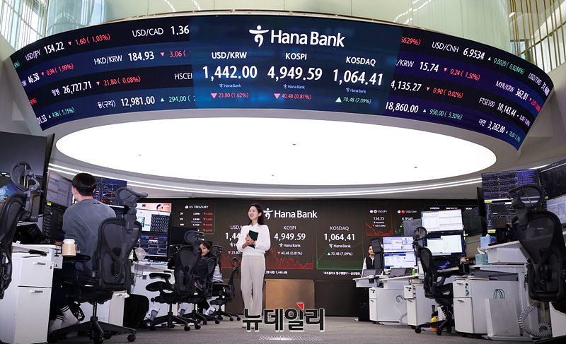 코스닥 지수가 4년여 만에 1,000선을 넘은 26일 오후 서울 서울 중구 하나은행 본점 딜링룸 현황판에 코스피와 원 달러 환율이 표시되고 있다.