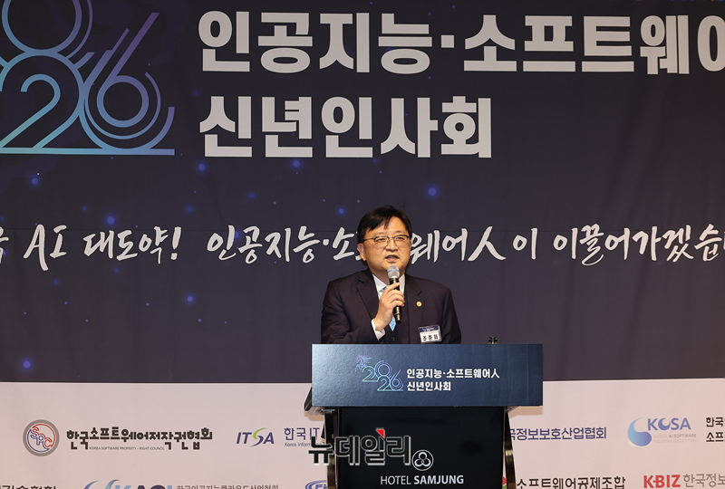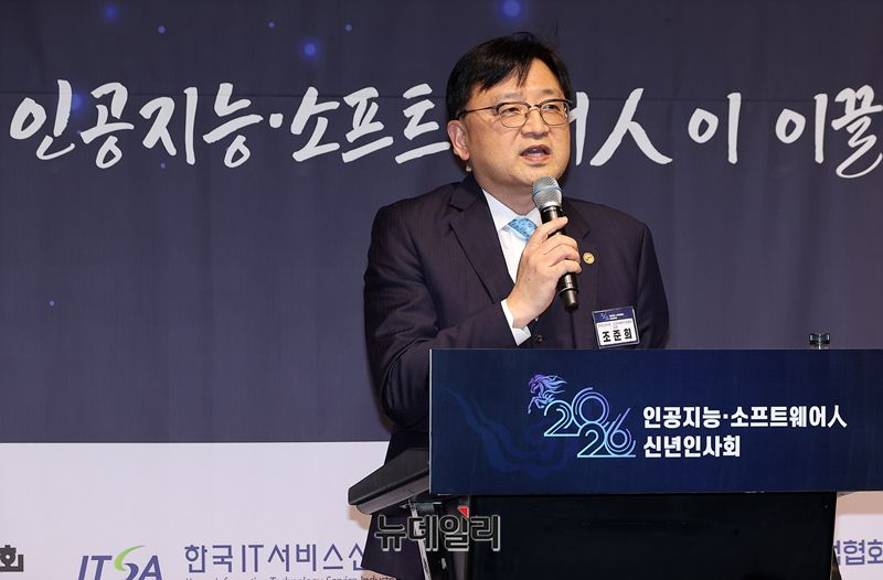 조준희 한국인공지능·소프트산업협회장이 29일 오후 서울 강남구 삼정호텔에서 열린 2026 인공지능·소프트웨어인 신년인사회에서 신년사를 하고 있다.