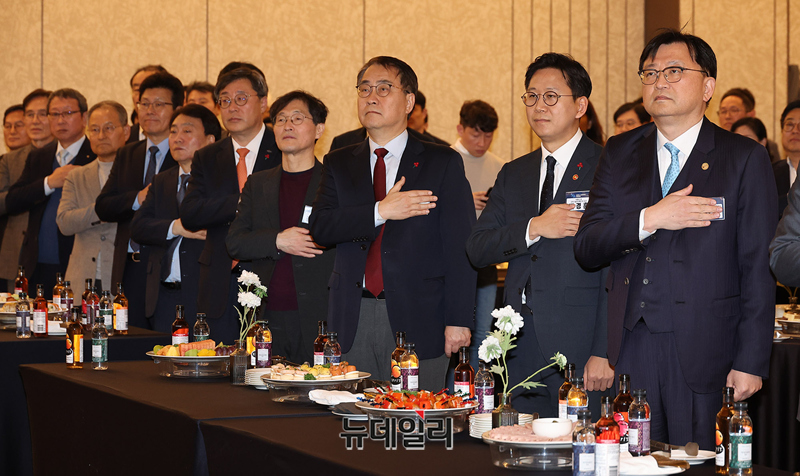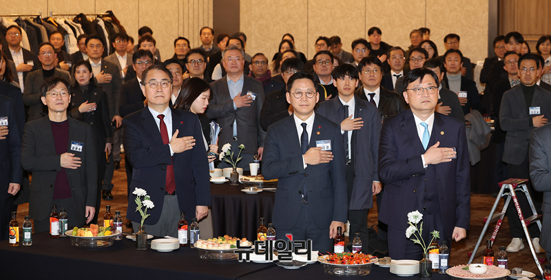 배경훈 과학기술정보통신부 장관, 최형두 국민의힘 의원, 조준희 협회장 등 회원사 대표들이 29일 오후 서울 강남구 삼정호텔에서 열린 2026 인공지능·소프트웨어인 신년인사회에서 국민의례를 하고 있다.