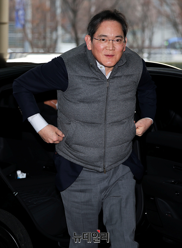 이재용 삼성전자 회장이 5일 오전 서울 강서구 김포국제공항 비즈니스항공센터를 통해 밀라노로 출국하며 취재진에게 인사말을 건네고 있다.