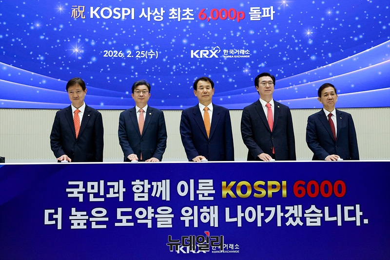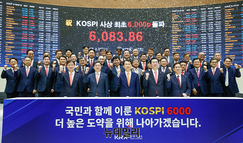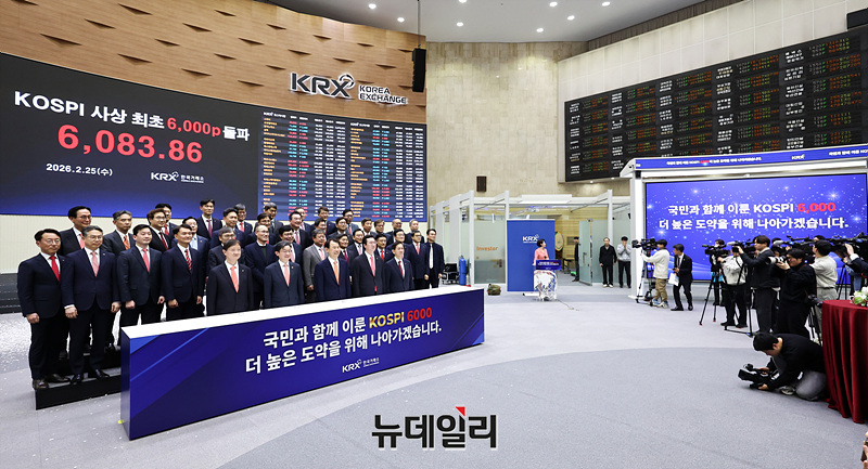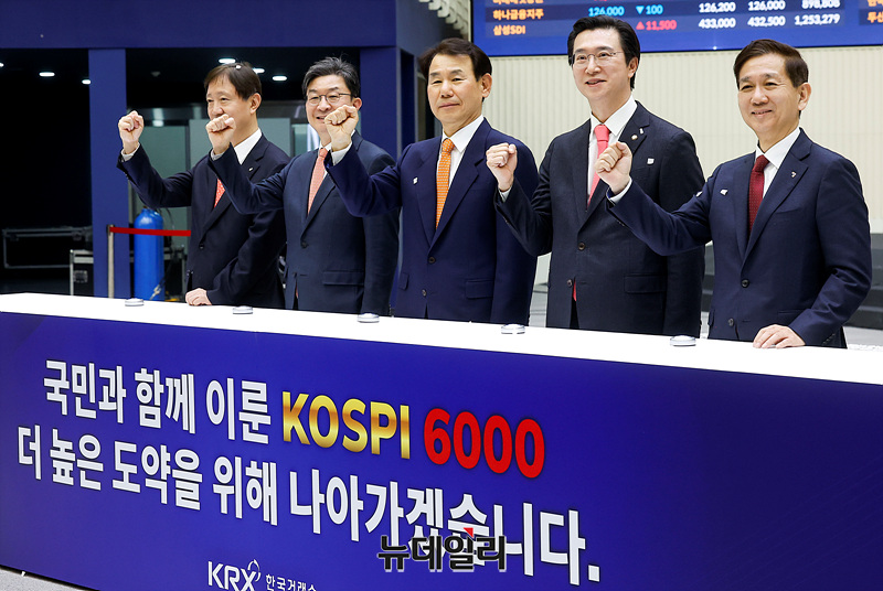 정은보 한국거래소 이사장과, 이찬진 금융감독원장, 이억원 금융위원장을 비롯한 참석자들이 25일 오후 서울 여의도 한국거래소에서 열린 코스피 6000p 기념행사에서 기념촬영을 하고 있다.