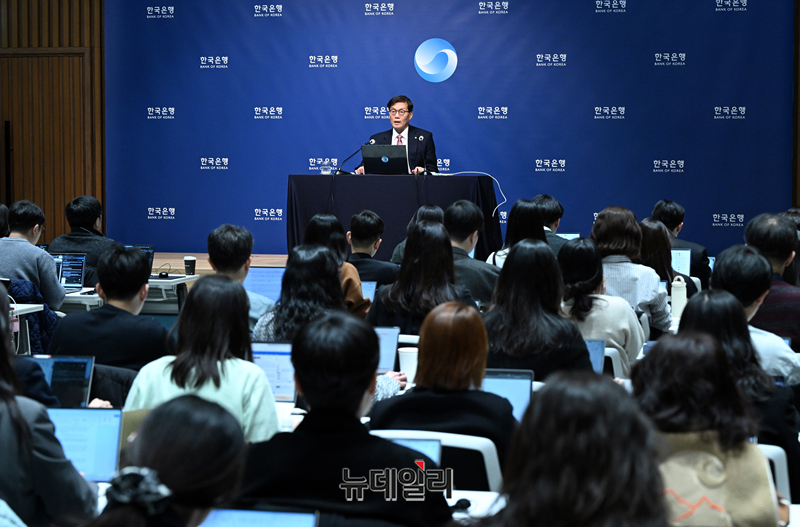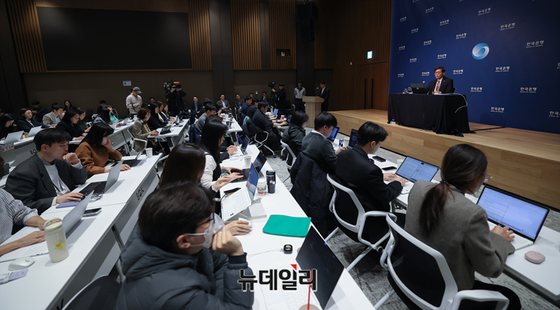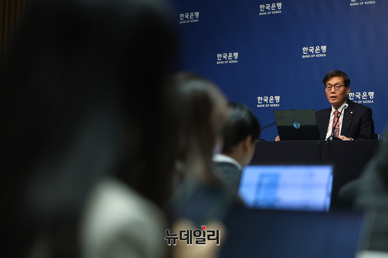 이창용 한국은행 총재가 26일 서울 중구 한국은행에서 열린 금융통화위원회 본회의를 마치고 기자간담회에 참석해 발언하고 있다. 이날 금통위는 기준금리를 6회 연속으로 연 2.5%로 동결했다. (사진=공동취재단)