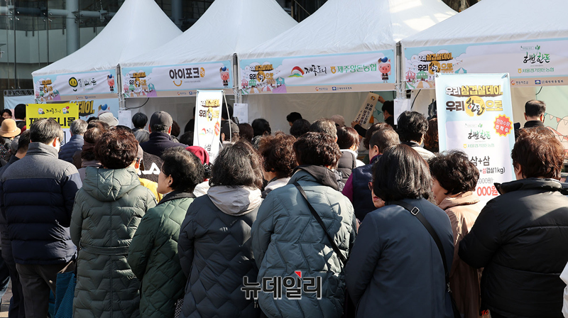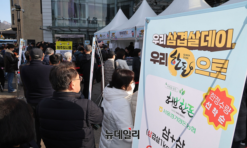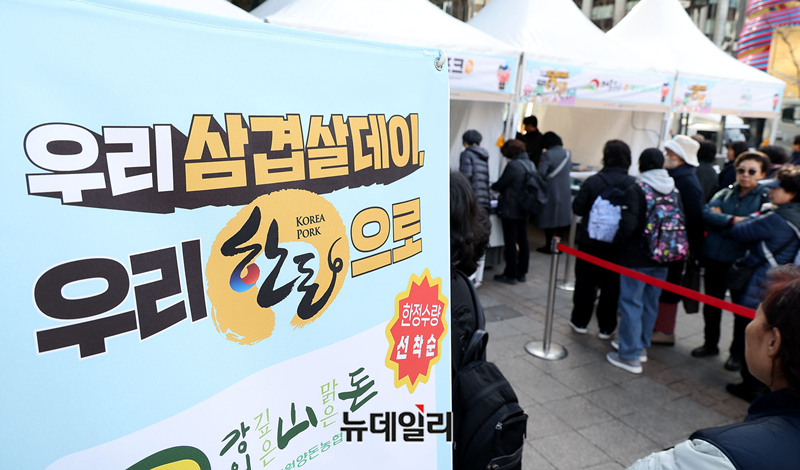 한돈자조금관리위원회가 27일 오전 서울 종로구 일민미술관 앞에서 2026년 삼겹살데이(3월 3일)를 앞두고 '우리 삼겹살데이, 우리 한돈으로' 소비촉진 행사를 진행한 가운데 고객들이 할인 판매하는 한돈을 구매하기 위해 긴 줄을 서 있다.먼저 2월 27일 서울 동아일보 앞 동아광장에서 현장 할인 판매가 진행된다. 행사장에서는 한돈 삼겹살·목살 1+1 꾸러미(1kg+1kg)를 최대 50% 할인된 가격에 판매한다. 이어 3월 2일부터 3일까지는 청주 서문시장 삼겹살거리 일대에서 할인 판매가 이어진다.이와 함께 삼겹살데이를 기점으로 한돈 공식 온라인몰과 전국 한돈인증점, 대형마트, 농협 유통채널에서도 할인 판매가 진행되며, 공식 SNS 채널에서는 ‘한돈 안 먹어본 사람 찾아라’ 이벤트도 함께 운영된다.