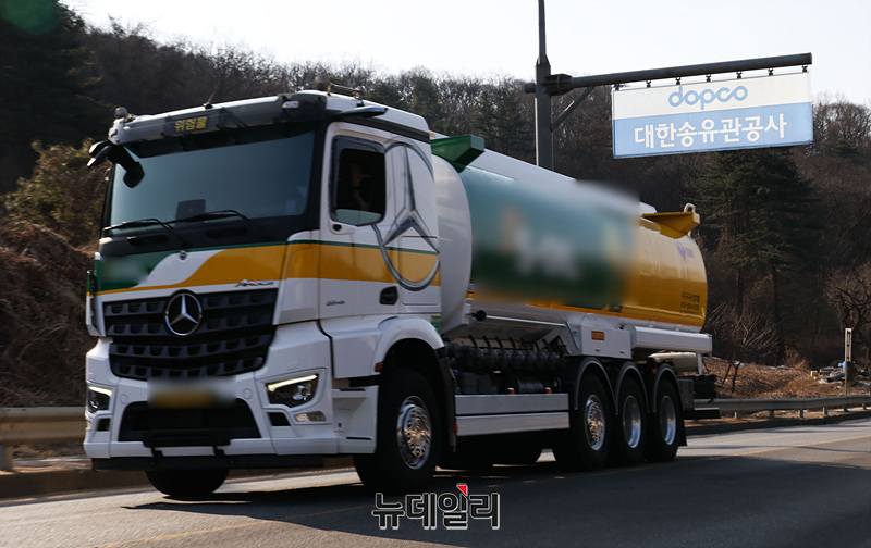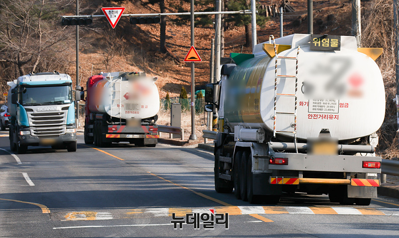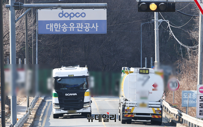 중동 정세 불안으로 국제 유가가 배럴당 100달러를 돌파하며 한국 정부가 30년만에 석유제품 최고가격제를 실행한 13일 오전 경기 성남시 대한송유관 공사 입구에서 유조차들이 분주히 움직이고 있다. 이번 조치는 1997년 유가 자유화 이후 처음이다. (경기 성남=서성진 기자)